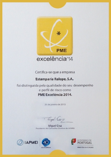 No dia 26 de Janeiro de 2015, a Estamparia Ralope recebeu o Certificado PME Excelência 2014, atribuido pelo IAPMEI (Isntituto de Apoio das Pequenas e Médias Empresas e à Inovação), sendo uma das 1845 empresas distingidas Nacionalmente.